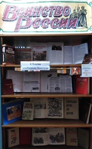 В районной библиотеке, к 75-летию полного освобождения Ленинграда от фашистской блокады в цикле Воинство России, работает книжно-иллюстративная выставка, посвященная этому событию. Выставка знакомит с книгами и материалами из периодических изданий, рассказывающими о причинах возникновения блокады, о тяжелых испытаниях, выпавших на долю ленинградцев и даст представление о долге, мужестве, героизме людей, переживших блокаду.