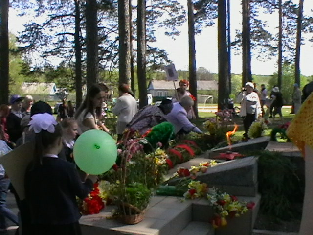 Участники шествия возложили к обелиску гирлянду и еловых веток, цветы.